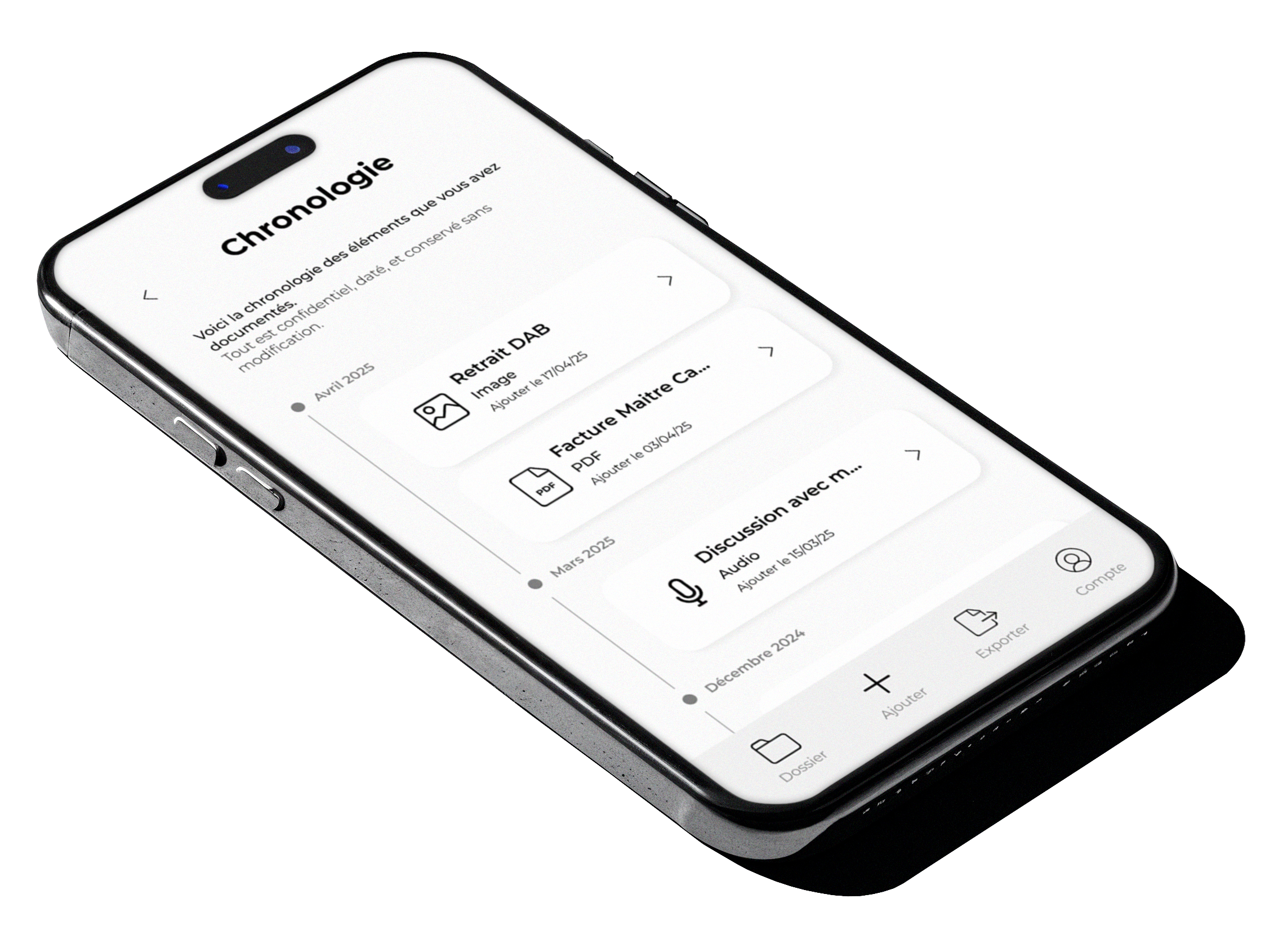 Vous retrouvez tout dans une chronologie claire, et vous pouvez exporter si nécessaire.